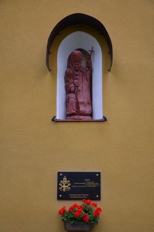 Rzeźba Ojca Świętego Jana Pawła II oraz płyta, która została umieszczona w tym miejscu i poświęcona w dniu kanonizacji Papieża.